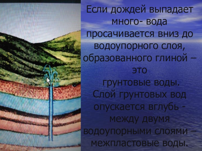 Слайд 6 Если дождей выпадает много- вода просачивается вниз до водоупорного слоя, образованного