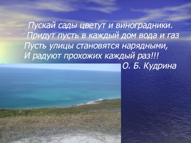 цветут и виноградники. Придут пусть в каждый дом вода и газ Пусть улицы становятся нарядными, И радуют прохожих каждый раз!!! О. Б. Кудрина