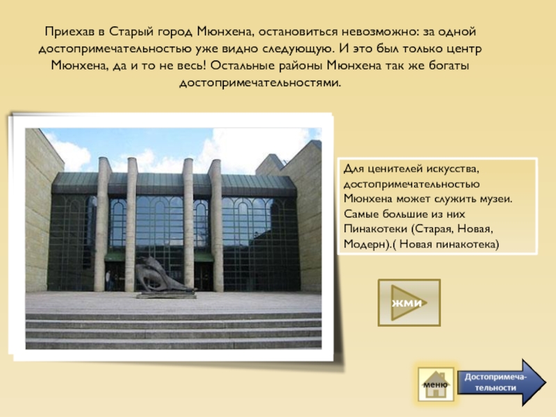 Для ценителей искусства, достопримечательностью Мюнхена может служить музеи. Самые большие из них Пинакотеки (Старая, Новая, Модерн).( Новая пинакотека)