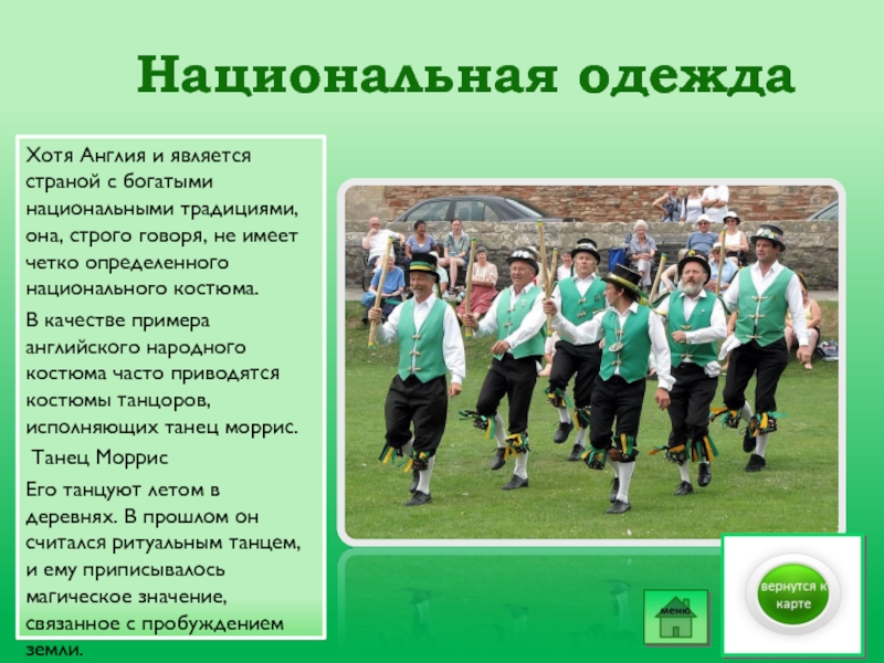 В качестве примера английского народного костюма часто приводятся костюмы танцоров, исполняющих танец моррис.