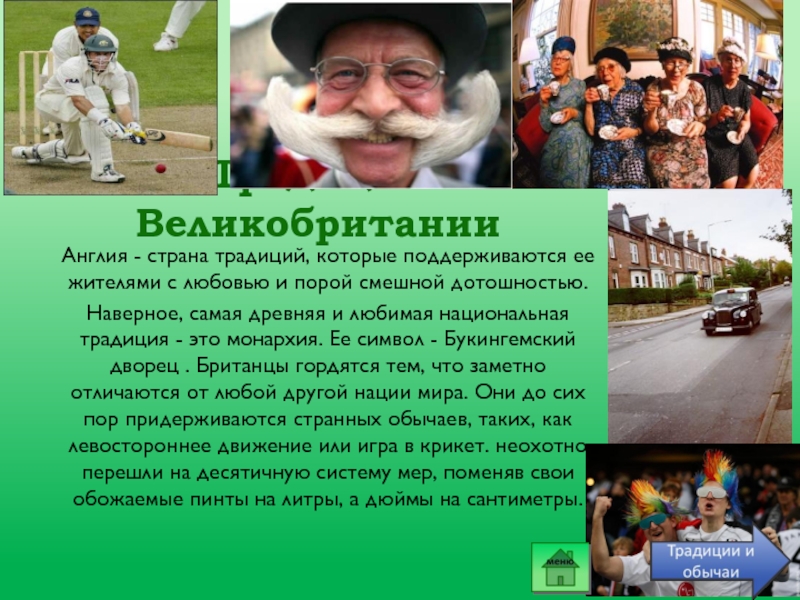 Наверное, самая древняя и любимая национальная традиция - это монархия. Ее символ - Букингемский дворец . Британцы гордятся тем, что заметно отличаются от любой другой нации мира. Они до сих пор придерживаются странных обычаев, таких, как левостороннее движение или игра в крикет. неохотно перешли на десятичную систему мер, поменяв свои обожаемые пинты на литры, а дюймы на сантиметры.