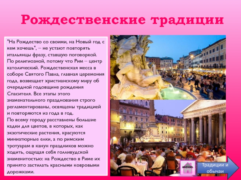 По всему городу расставлены большие кадки для цветов, в которых, как экзотические растения, красуются миниатюрные елки, а по римским тротуарам в канун праздников можно ходить, ощущая себя голливудской знаменитостью: на Рождество в Риме их принято застилать красными ковровыми дорожками.