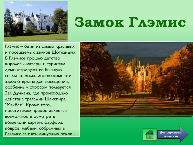 В Глэмисе прошло детство королевы-матери, и туристам демонстрируют ее бывшую спальню. Большинство комнат и залов открыты для посещения, особенным спросом пользуется Зал Дункана, где происходило действие трагедии Шекспира "Макбет". Кроме того, посетителям предоставляется возможность осмотреть коллекции картин, фарфора, ковров, мебели, собранных в Глэмисе за пять минувших веков...