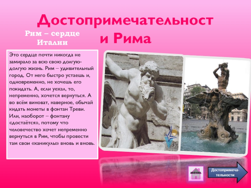 свою долгую-долгую жизнь. Рим – удивительный город. От него быстро устаешь и, одновременно, не хочешь его покидать. А, если уехал, то, непременно, хочется вернуться. А во всём виноват, наверное, обычай кидать монеты в фонтан Треви. Или, наоборот – фонтану «достаётся», потому что человечество хочет непременно вернуться в Рим, чтобы провести там свои «каникулы» вновь и вновь.