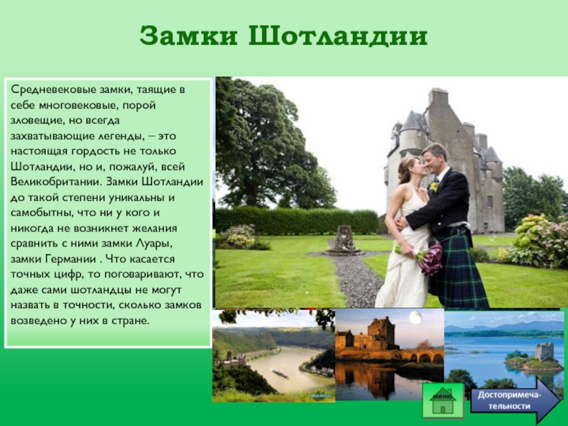 захватывающие легенды, – это настоящая гордость не только Шотландии, но и, пожалуй, всей Великобритании. Замки Шотландии до такой степени уникальны и самобытны, что ни у кого и никогда не возникнет желания сравнить с ними замки Луары, замки Германии . Что касается точных цифр, то поговаривают, что даже сами шотландцы не могут назвать в точности, сколько замков возведено у них в стране.