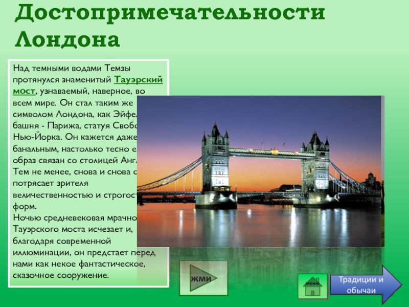 из древнейших городов Европы. Столица Великобритании является очень популярным городом для туристов не только в своей стране, но и Европе в целом; в Лондоне есть множество достопримечательностей, многие из которых внесены в Список Всемирного Наследия ЮНЕСКО. Всем известны такие названия, как Биг Бен, Тауэр, Вестминстер, Букингемский дворец, Трафальгарская площадь и т.д