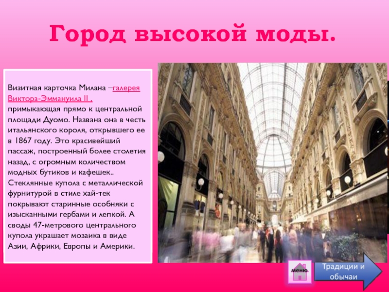 Визитная карточка Милана –галерея Виктора-Эммануила II , примыкающая прямо к центральной площади Дуомо. Названа она в честь итальянского короля, открывшего ее в 1867 году. Это красивейший пассаж, построенный более столетия назад, с огромным количеством модных бутиков и кафешек.. Стеклянные купола с металлической фурнитурой в стиле хай-тек покрывают старинные особняки с изысканными гербами и лепкой. А своды 47-метрового центрального купола украшает мозаика в виде Азии, Африки, Европы и Америки.