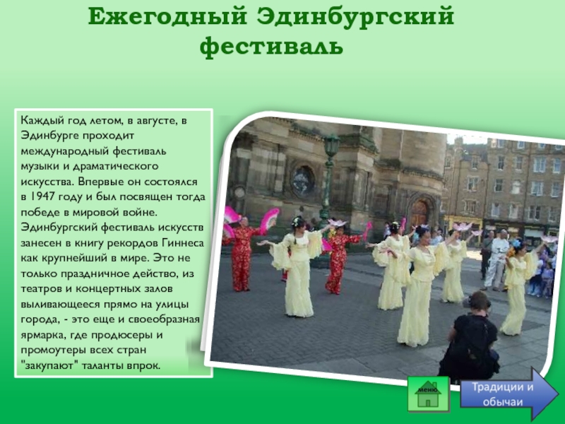 Слайд 54Каждый год летом, в августе, в Эдинбурге проходит международный фестиваль музыки