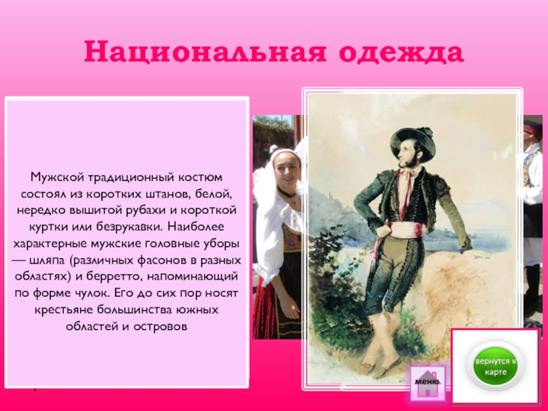 Мужской традиционный костюм состоял из коротких штанов, белой, нередко вышитой рубахи и короткой куртки или безрукавки. Наиболее характерные мужские головные уборы — шляпа (различных фасонов в разных областях) и берретто, напоминающий по форме чулок. Его до сих пор носят крестьяне большинства южных областей и островов