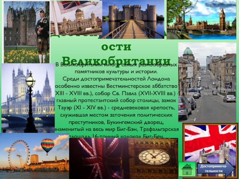 достопримечательностей Лондона особенно известны Вестминстерское аббатство (XIII - XVIII вв.), собор Св. Павла (XVII-XVIII вв.) - главный протестантский собор столицы, замок Тауэр (XI - XIV вв.) - средневековая крепость, служившая местом заточения политических преступников, Букингемский дворец, знаменитый на весь мир Биг-Бэн, Трафальгарская площадь,16-тонный колокол Биг-Бен.