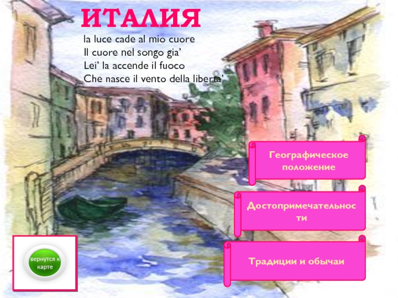 искусства будут восхищаться бесчисленными шедеврами зодчества и живописи. Гурманов пленят вкуснейшие блюда итальянской кухни из самых простых продуктов, а любителей природы ждут прекрасные ландшафты, которыми славятся все области Италии. Благодаря теплому климату и бесчисленным памятникам старины Италия является одним из крупнейших центров мирового туризма.