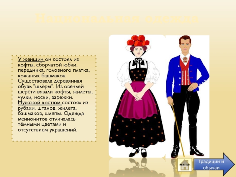 платка, кожаных башмаков. Существовала деревянная обувь "шлёры". Из овечьей шерсти вязали кофты, жилеты, чулки, носки, варежки. Мужской костюм состоял из рубахи, штанов, жилета, башмаков, шляпы. Одежда меннонитов отличалась тёмными цветами и отсутствием украшений.