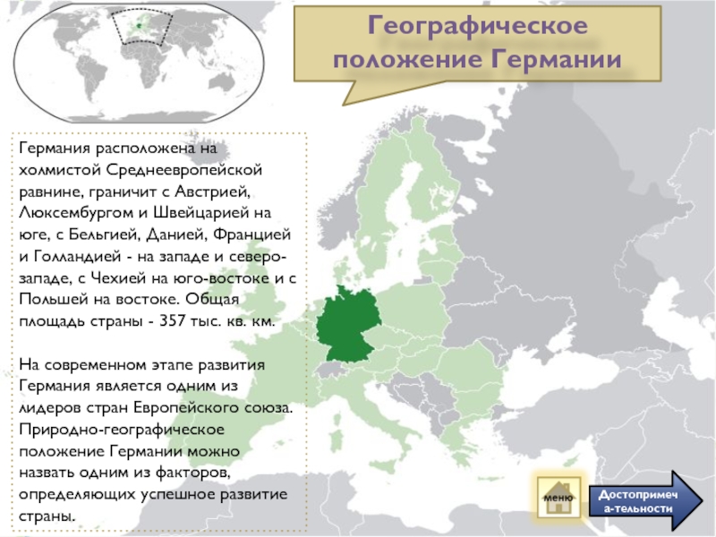 Германия расположена на холмистой Среднеевропейской равнине, граничит с Австрией,