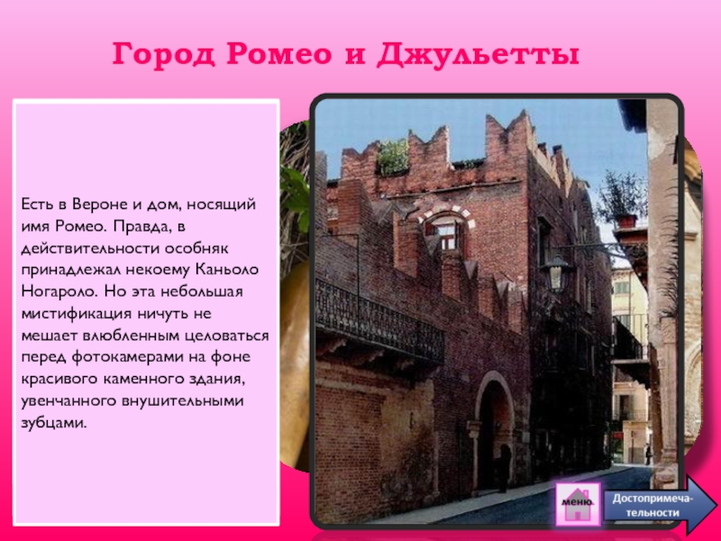 Есть в Вероне и дом, носящий имя Ромео. Правда, в действительности особняк принадлежал некоему Каньоло Ногароло. Но эта небольшая мистификация ничуть не мешает влюбленным целоваться перед фотокамерами на фоне красивого каменного здания, увенчанного внушительными зубцами.