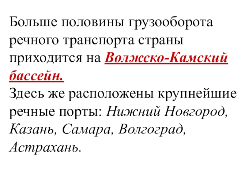 Слайд 22Больше половины грузооборота речного транспорта страны приходится на Волжско-Камский бассейн.