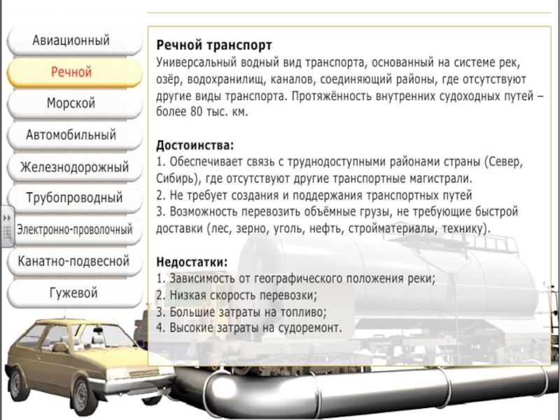 Слайд 18Транспорт, осуществляющий перевозки грузов и пассажиров судами по внутренним водным путям