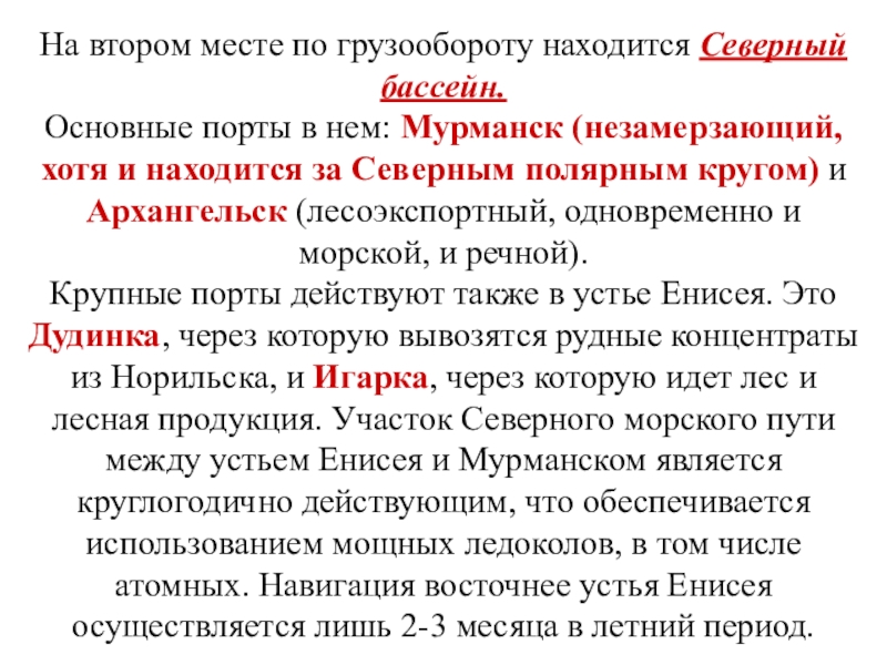 Крупные порты действуют также в устье Енисея. Это Дудинка, через которую вывозятся рудные концентраты из Норильска, и Игарка, через которую идет лес и лесная продукция. Участок Северного морского пути между устьем Енисея и Мурманском является круглогодично действующим, что обеспечивается использованием мощных ледоколов, в том числе атомных. Навигация восточнее устья Енисея осуществляется лишь 2-3 месяца в летний период.