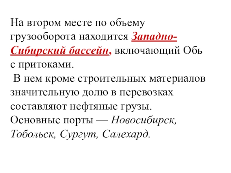 Слайд 23На втором месте по объему грузооборота находится Западно-Сибирский бассейн, включающий Обь