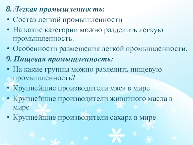 8. Легкая промышленность:Состав легкой промышленностиНа какие категории можно разделить легкую промышленность.Особенности размещения легкой промышленности.9. Пищевая промышленность:На какие