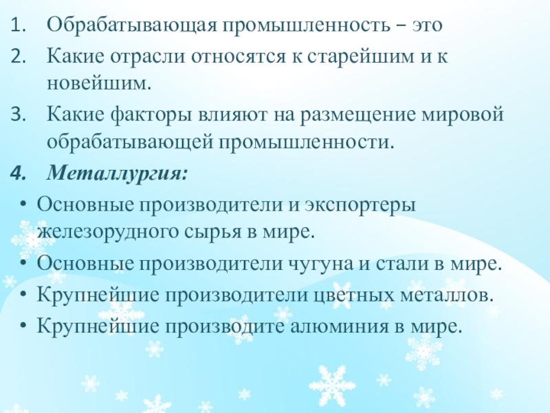 Обрабатывающая промышленность – этоКакие отрасли относятся к старейшим и к новейшим.Какие факторы влияют на размещение мировой обрабатывающей промышленности.Металлургия: Основные производители и экспортеры железорудного сырья в мире.Основные производители чугуна и стали в мире.Крупнейшие производители цветных металлов.Крупнейшие производите