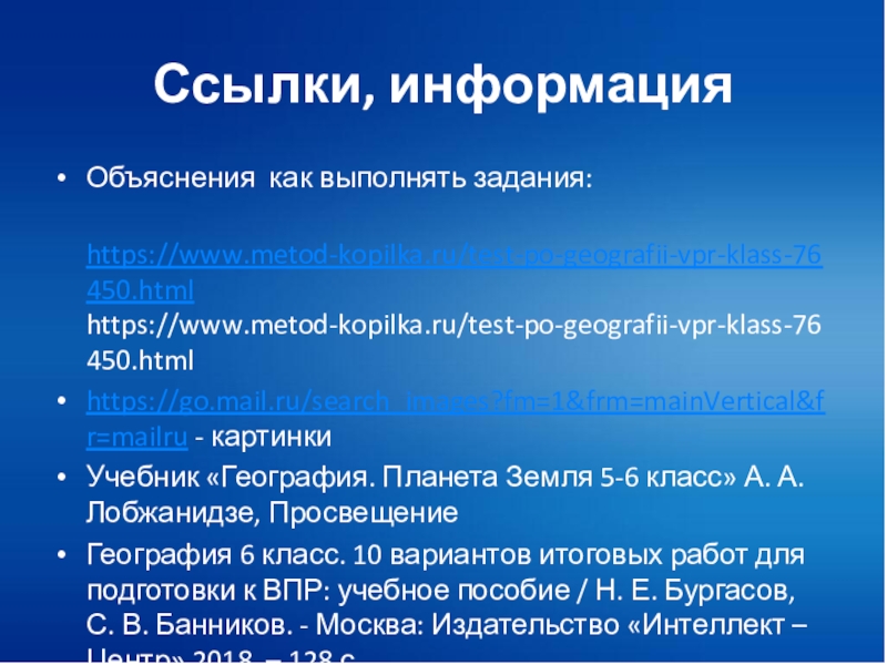 Ссылки, информацияОбъяснения как выполнять задания:     https://www.metod-kopilka.ru/test-po-geografii-vpr-klass-76450.html  https://www.metod-kopilka.ru/test-po-geografii-vpr-klass-76450.html https://go.mail.ru/search_images?fm=1&frm=mainVertical&fr=mailru - картинкиУчебник «География. Планета
