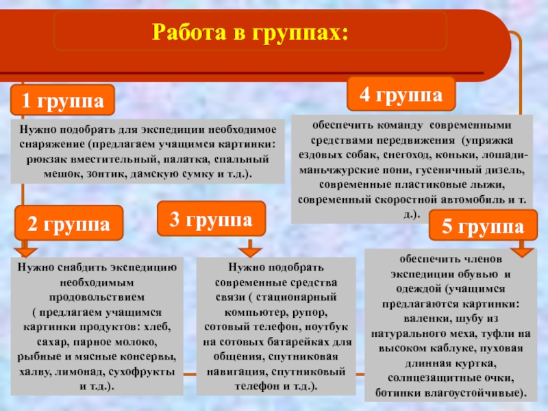 Нужно подобрать для экспедиции необходимое снаряжение (предлагаем учащимся картинки: рюкзак вместительный, палатка, спальный мешок, зонтик, дамскую сумку и т.д.).