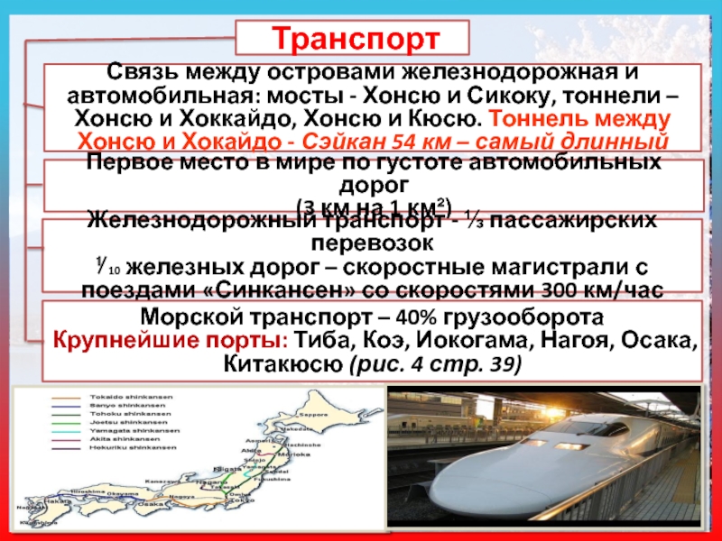Крупнейшие порты: Тиба, Коэ, Иокогама, Нагоя, Осака, Китакюсю (рис. 4 стр. 39)