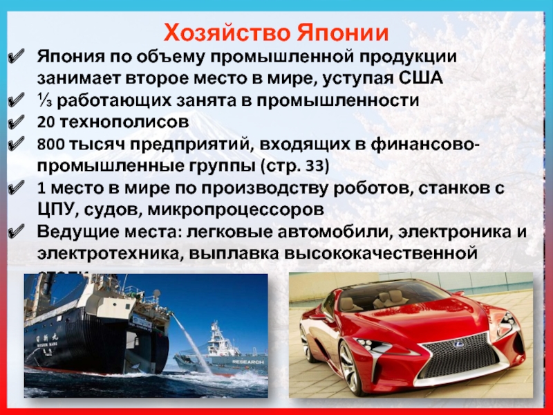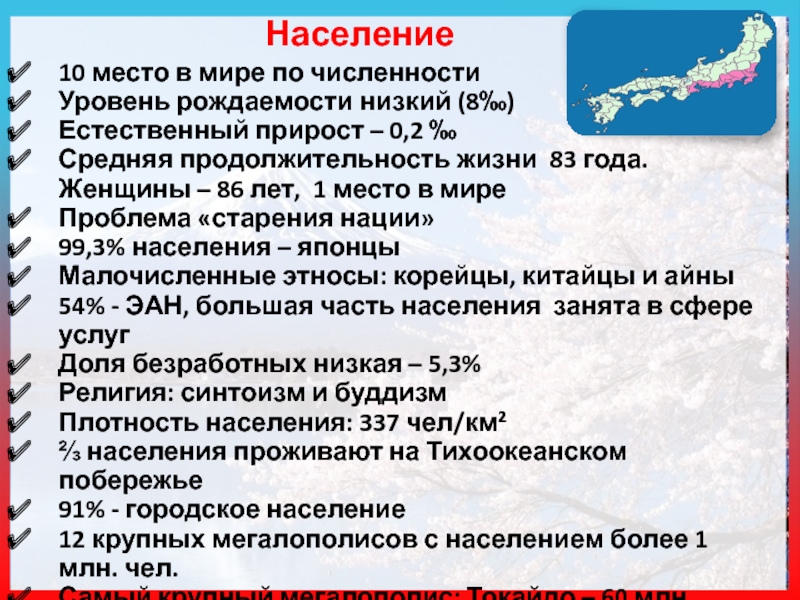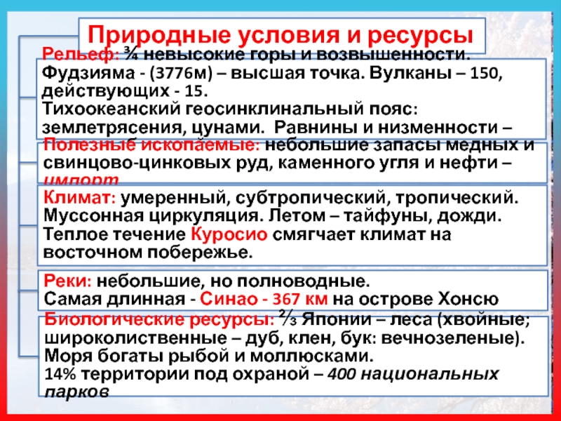 Биологические ресурсы: ⅔ Японии – леса (хвойные; широколиственные – дуб, клен, бук: вечнозеленые).