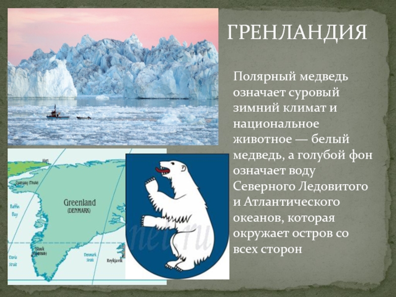 Полярный медведь означает суровый зимний климат и национальное животное — белый медведь, а голубой фон означает воду Северного Ледовитого и Атлантического океанов, которая окружает остров со всех сторон