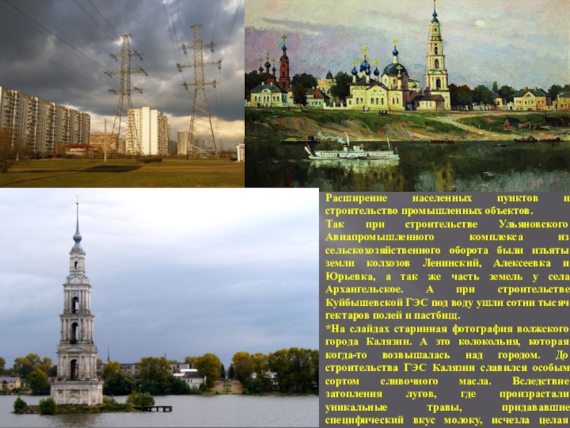 *На слайдах старинная фотография волжского города Калязин. А это колокольня, которая когда-то возвышалась над городом. До строительства ГЭС Калязин славился особым сортом сливочного масла. Вследствие затопления лугов, где произрастали уникальные травы, придававшие специфический вкус молоку, исчезла целая отрасль пищевой промышленности этого города. А сам город перенесли на возвышенность.