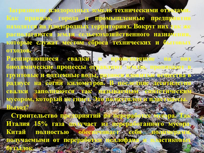 Слайд 12 Загрязнение плодородных земель техническими отходами. Как правило, города и промышленные
