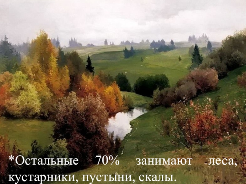 Слайд 4*Остальные 70% занимают леса, кустарники, пустыни, скалы.