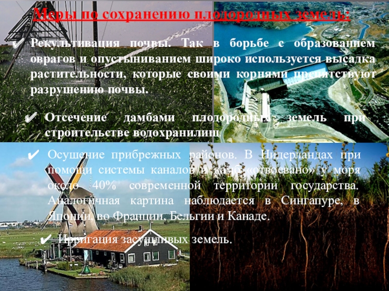 Осушение прибрежных районов. В Нидерландах при помощи системы каналов и дамб «отвоевано» у моря около 40% современной территории государства. Аналогичная картина наблюдается в Сингапуре, в Японии, во Франции, Бельгии и Канаде.