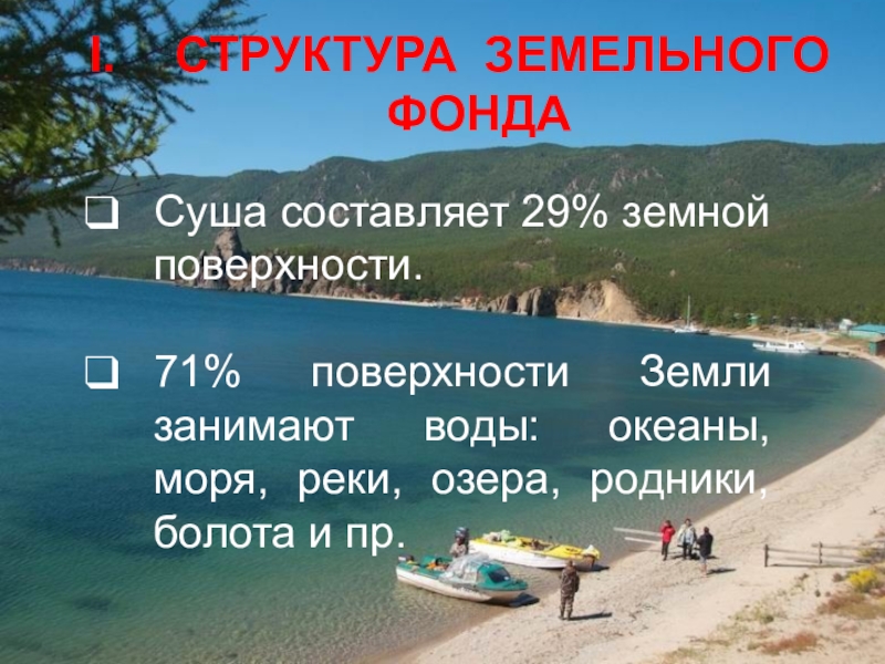 Земли занимают воды: океаны, моря, реки, озера, родники, болота и пр.