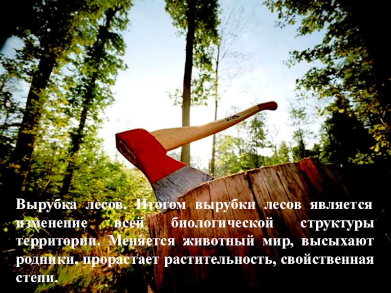 Слайд 10Вырубка лесов. Итогом вырубки лесов является изменение всей биологической структуры территории.