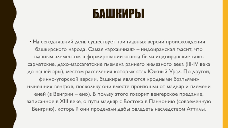 «архаичная» – индоиранская гласит, что главным элементом в формировании этноса были индоиранские сако-сарматские, дахо-массагетские племена раннего железного века (III-IV века до нашей эры), местом расселения которых стал Южный Урал. По другой, финно-угорской версии, башкиры являются «родными братьями» нынешних венгров, поскольку они вместе произошли от мадьяр и племени еней (в Венгрии – ено). В пользу этого говорит венгерское предание, записанное в XIII веке, о пути мадьяр с Востока в Паннонию (современную Венгрию), который они проделали дабы овладеть наследством Аттилы.