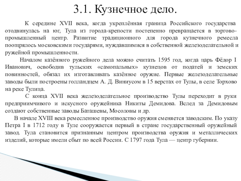 При Петре I Тула становиться по истине промышленным городом ,слава её мастером ходит по всей стране и за её пределами.