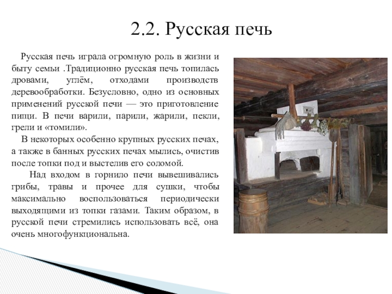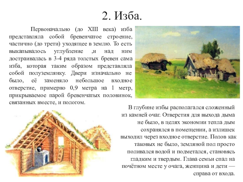 В глубине избы располагался сложенный из камней очаг. Отверстия для выхода дыма не было, в целях экономии тепла дым сохранялся в помещении, а излишек выходил через входное отверстие. Полов как таковых не было, земляной пол просто поливался водой и подметался, становясь гладким и твердым. Глава семьи спал на почётном месте у очага, женщина и дети — справа от входа.
