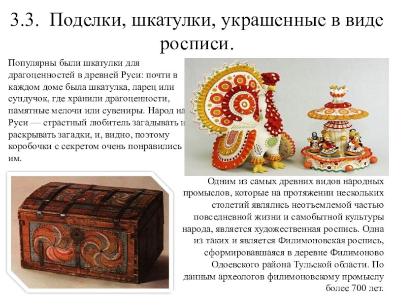 Одним из самых древних видов народных промыслов, которые на протяжении нескольких столетий являлись неотъемлемой частью повседневной жизни и самобытной культуры народа, является художественная роспись. Одна из таких и является Филимоновская роспись, сформировавшаяся в деревне Филимоново Одоевского района Тульской области. По данным археологов филимоновскому промыслу более 700 лет.