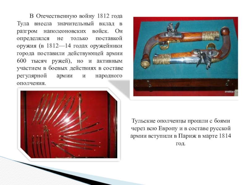 Тульские ополченцы прошли с боями через всю Европу и в составе русской армии вступили в Париж в марте 1814 год.