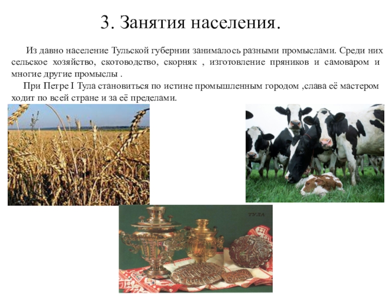 Из давно население Тульской губернии занималось разными промыслами. Среди них сельское хозяйство, скотоводство, скорняк , изготовление пряников и самоваром и многие другие промыслы .