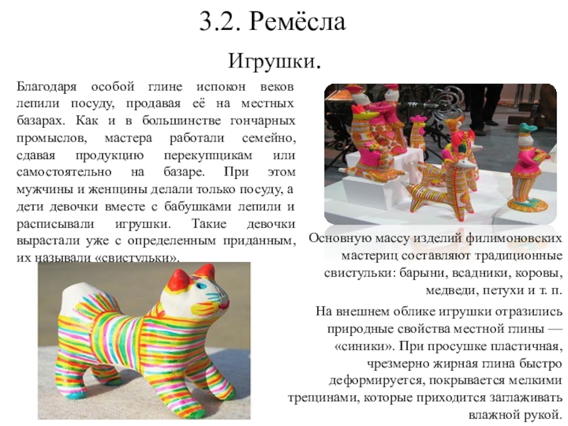Основную массу изделий филимоновских мастериц составляют традиционные свистульки: барыни, всадники, коровы, медведи, петухи и т. п.