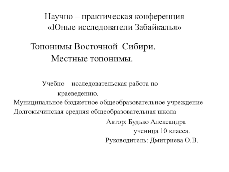 исследовать топонимы Восточной Сибири, Забайкальского края и своей местности.