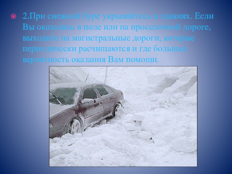 2.При снежной буре укрывайтесь в зданиях. Если Вы оказались в поле или на проселочной дороге, выходите на
