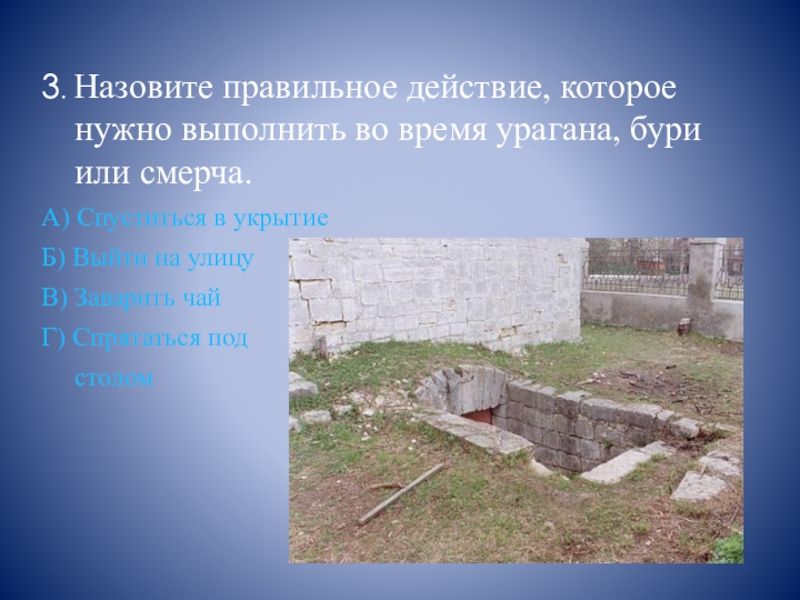 3. Назовите правильное действие, которое нужно выполнить во время урагана, бури или смерча.А) Спуститься в укрытиеБ) Выйти