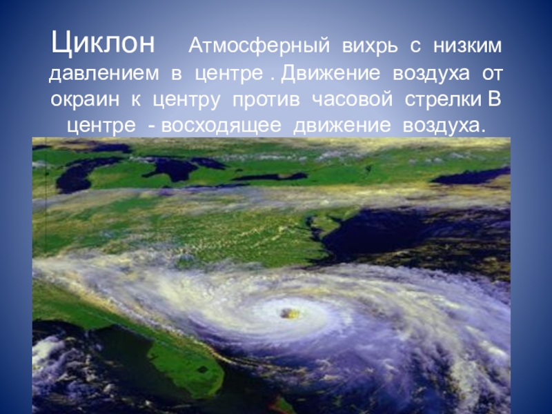 Слайд 6 Циклон Атмосферный вихрь с низким давлением в