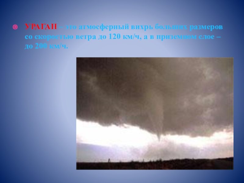 Слайд 10УРАГАН – это атмосферный вихрь больших размеров со скоростью ветра до