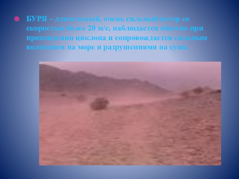 Слайд 14БУРЯ – длительный, очень сильный ветер со скоростью более 20 м/с,
