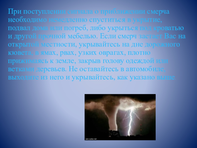 подвал дома или погреб, либо укрыться под кроватью и другой прочной мебелью. Если смерч застает Вас на открытой местности, укрывайтесь на дне дорожного кювета, в ямах, рвах, узких оврагах, плотно прижимаясь к земле, закрыв голову одеждой или ветками деревьев. Не оставайтесь в автомобиле, выходите из него и укрывайтесь, как указано выше.