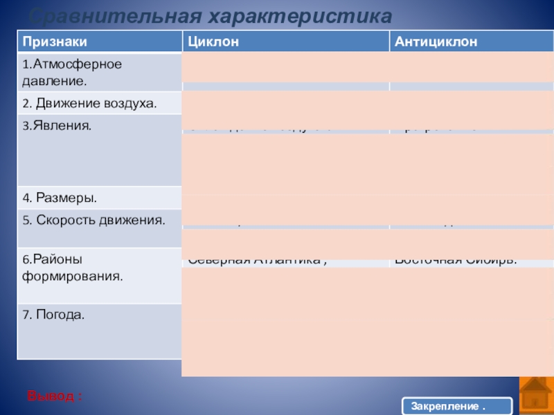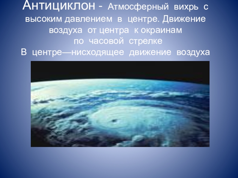 Слайд 7 Антициклон - Атмосферный вихрь с высоким давлением в центре. Движение воздуха